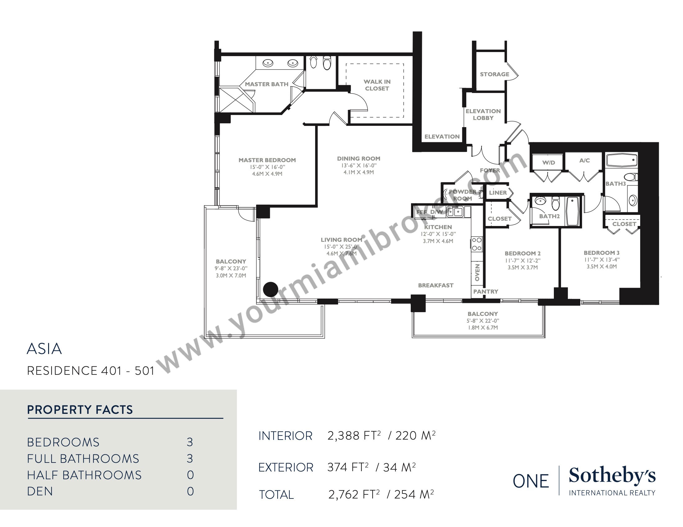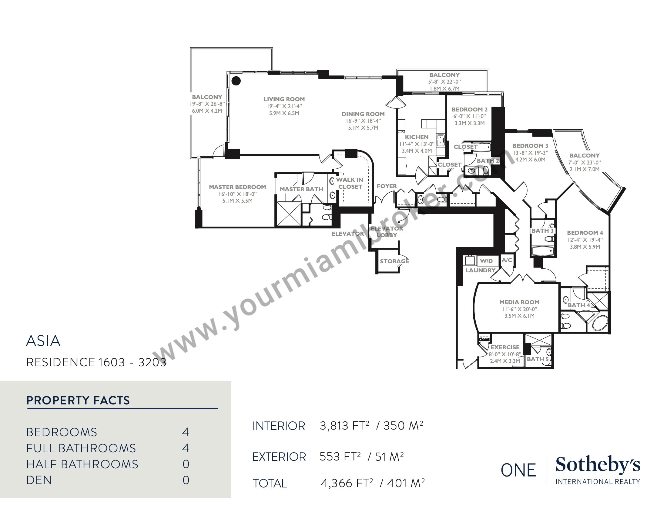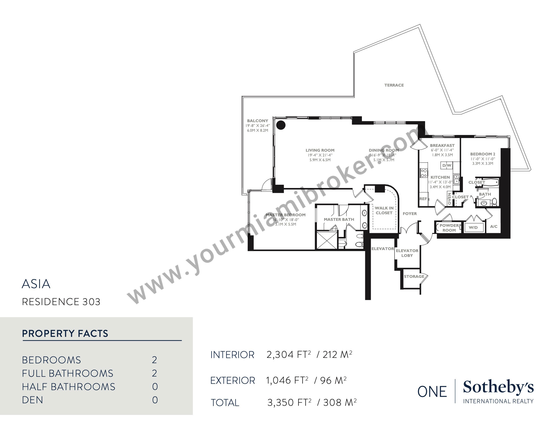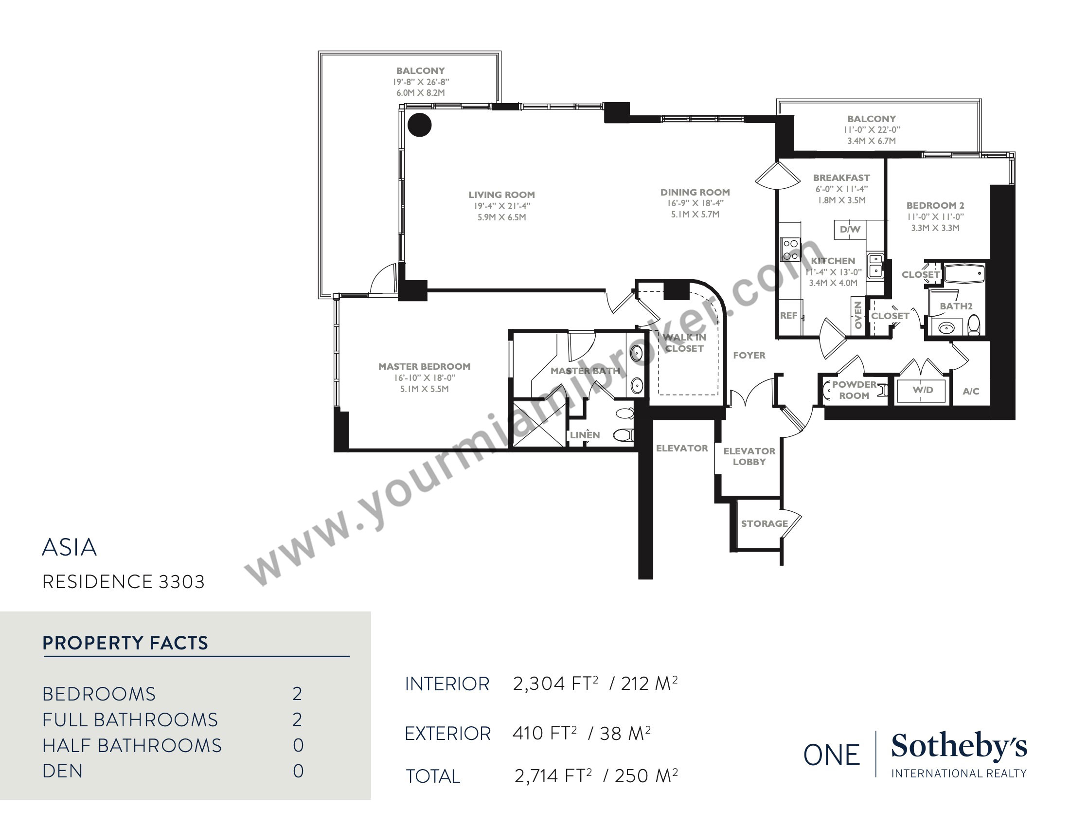 Asia is one of the most unique structures in Brickell Key, but despite rising more than 480 feet into the sky and taking the spot as Miami’s 20th tallest building, the mega-condominium houses no more than five residences per floor to assure privacy. It’s exclusive location means views of the Miami River, Biscayne Bay, and the Downtown skyline and its interiors boast 12 foot ceilings and up to four massive bedrooms.