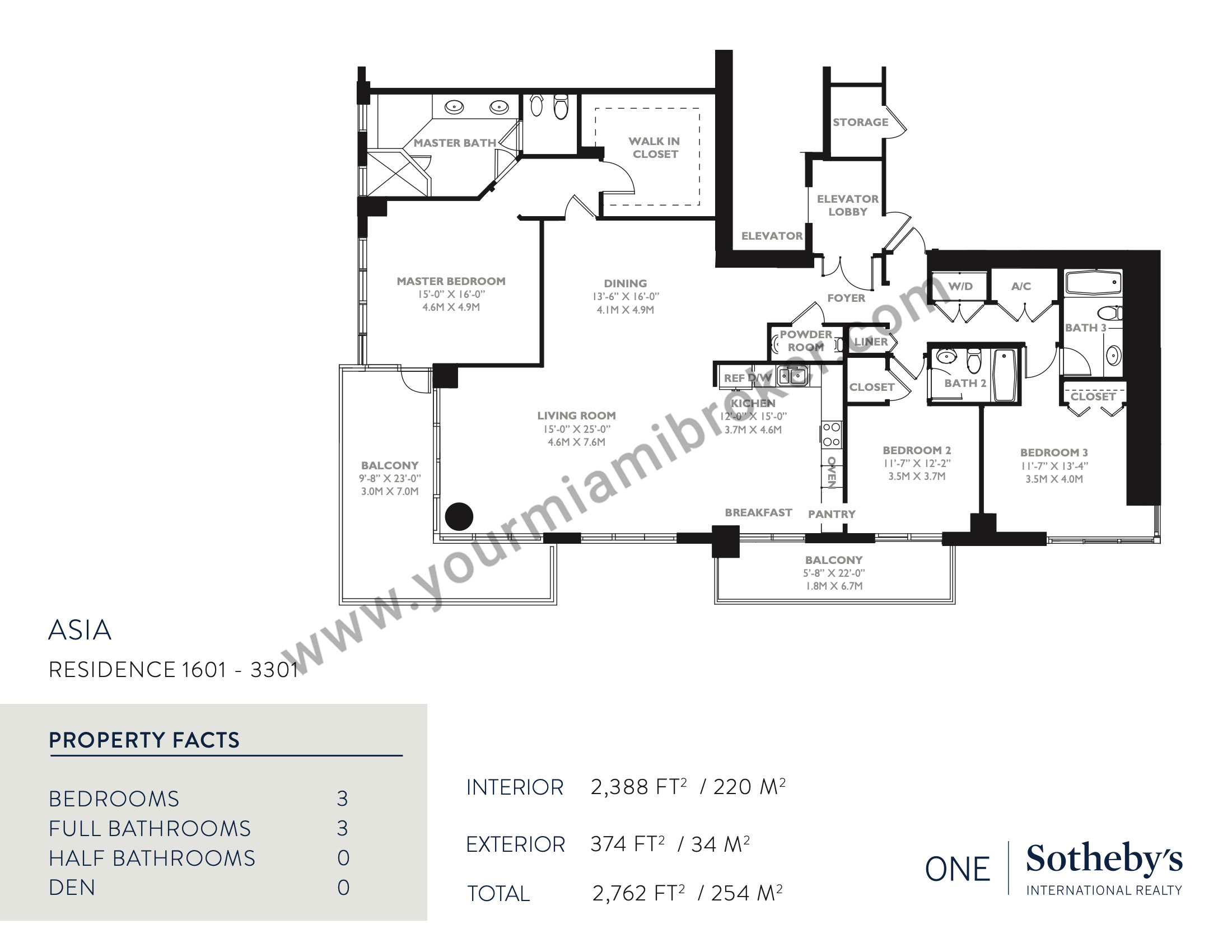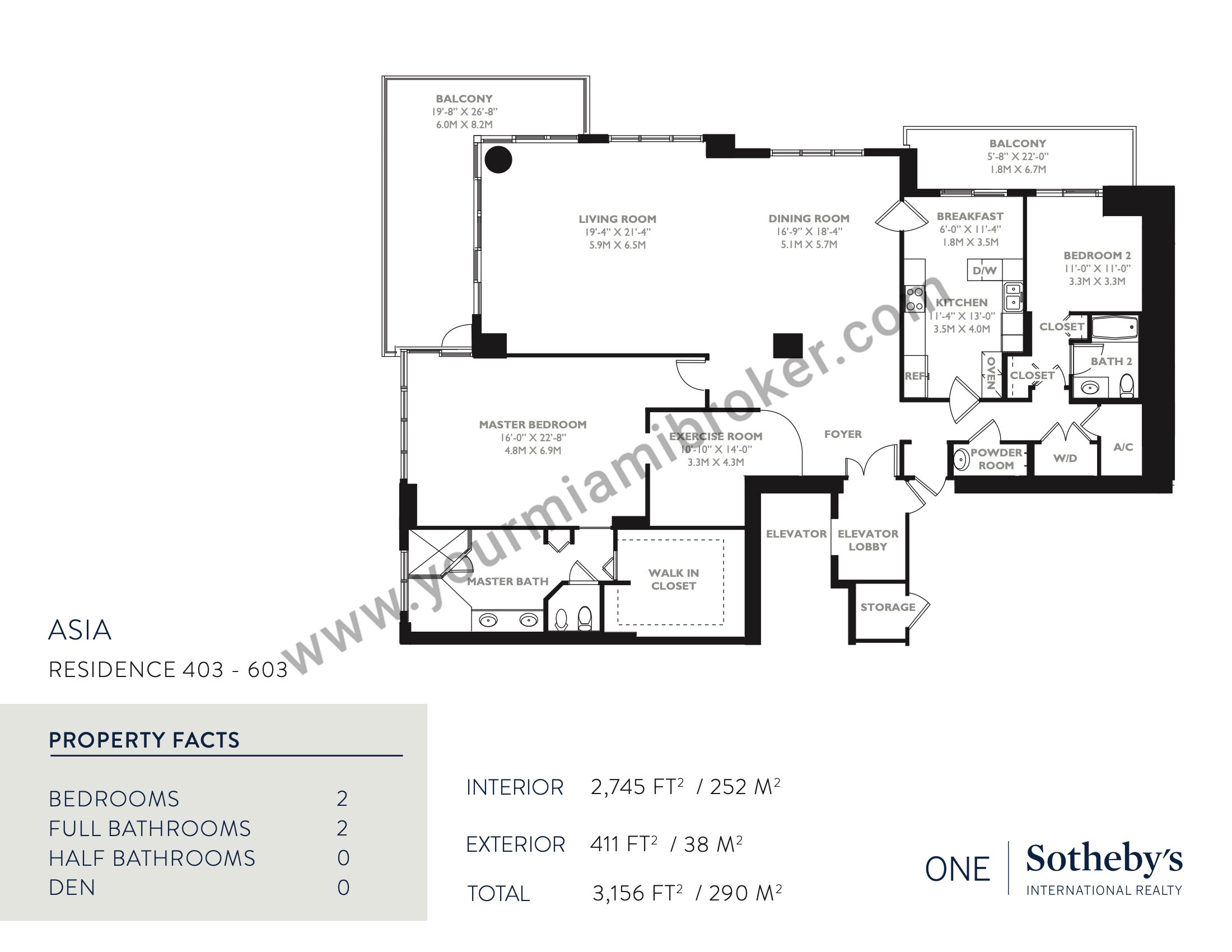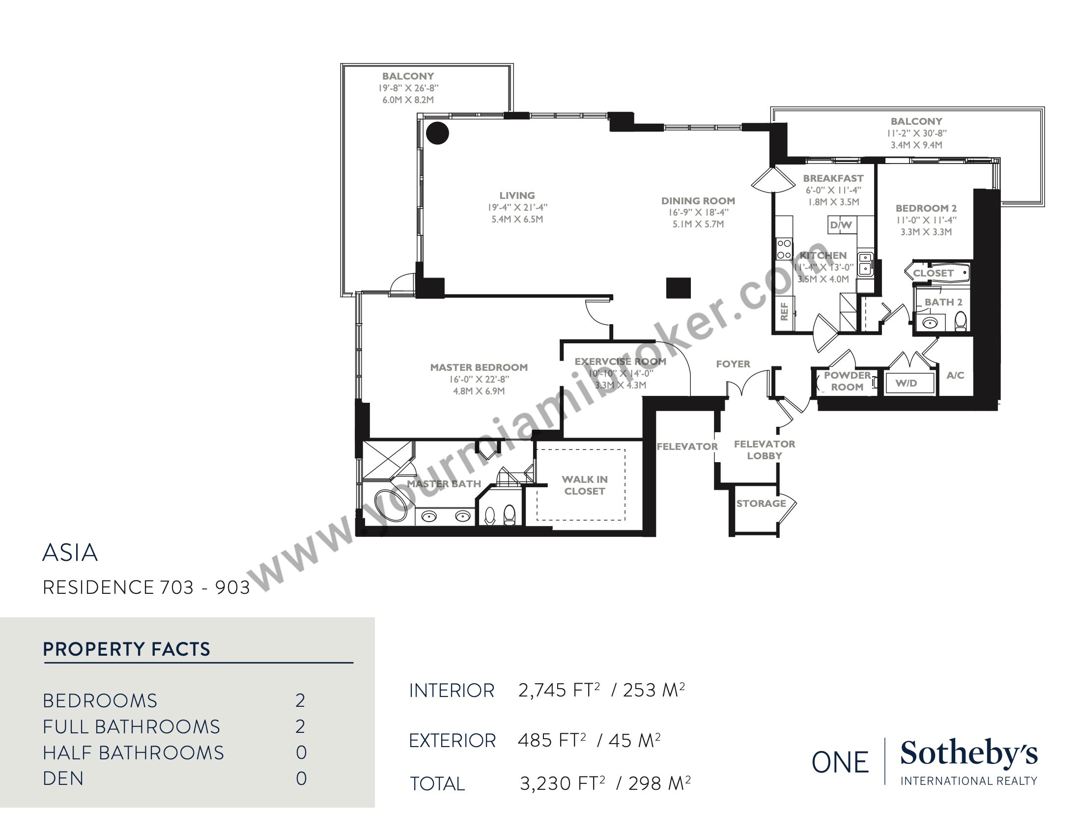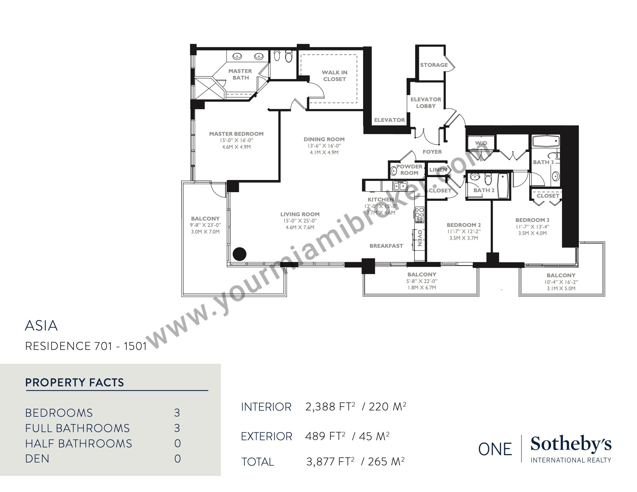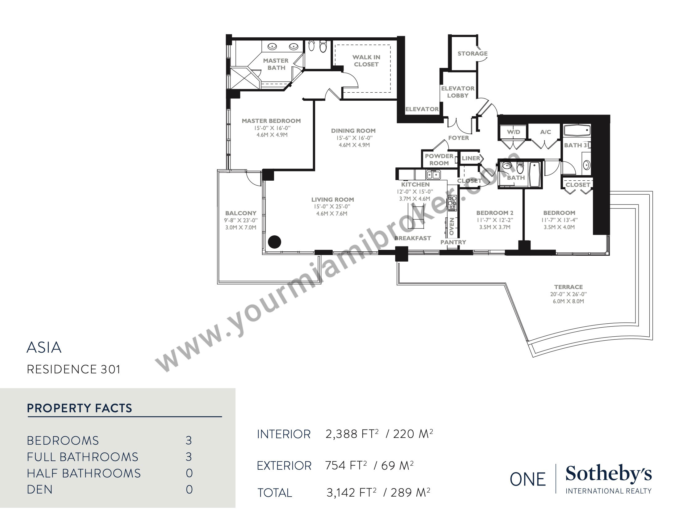 Asia is one of the most unique structures in Brickell Key, but despite rising more than 480 feet into the sky and taking the spot as Miami’s 20th tallest building, the mega-condominium houses no more than five residences per floor to assure privacy. It’s exclusive location means views of the Miami River, Biscayne Bay, and the Downtown skyline and its interiors boast 12 foot ceilings and up to four massive bedrooms.